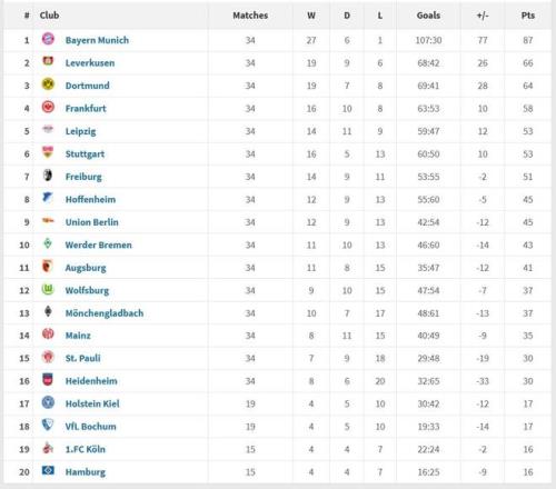 第二名是勒沃库森,全年取得19胜9平6负的战绩,第三名是多特,19胜7平8负。