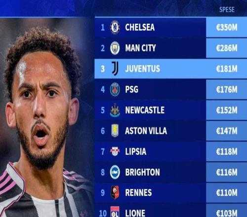 德转列过去5年冬窗引援支出排名:切尔西、曼城、尤文前三