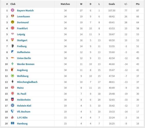德甲2025年度积分榜:拜仁34场仅1负打进107球,领先第二21分